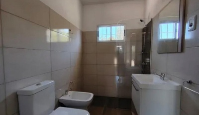 Un baño completo hecho a nuevo. Cocina reciclada con placares sobre y bajo mesada, salida a patio trasero.